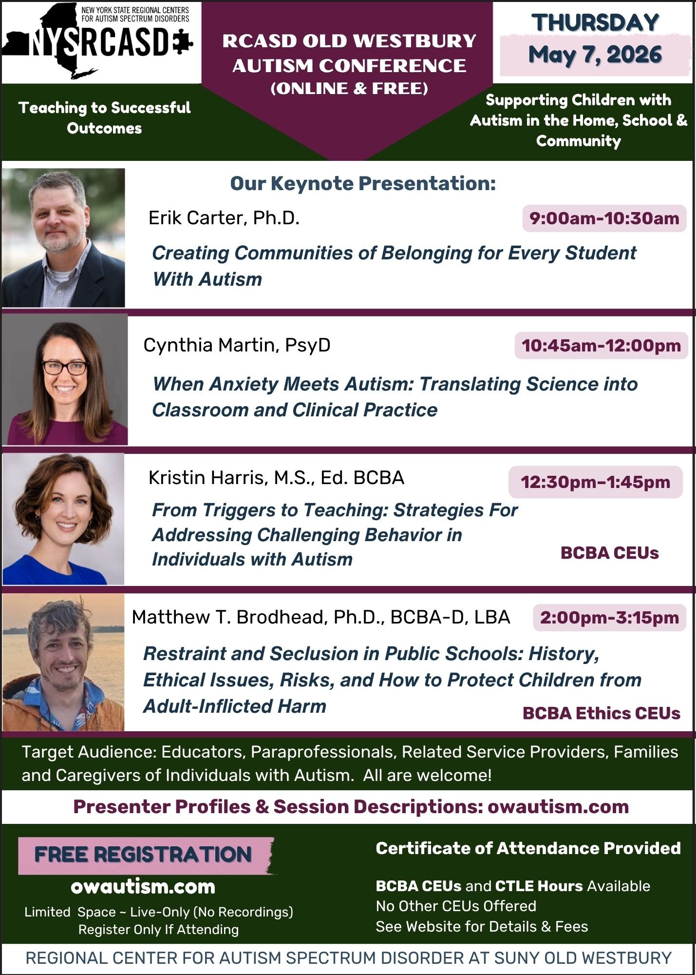 Join us on Thursday, May 7th for our free autism conference on Zoom. Open to all families, educators, administrators, paraprofessionals, related service providers, caregivers, students, and individuals with autism.